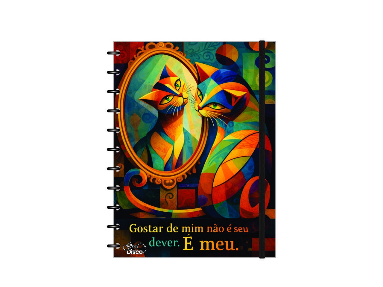 Caderno Graf Disco Grande: Capa dura com laminação fosca.