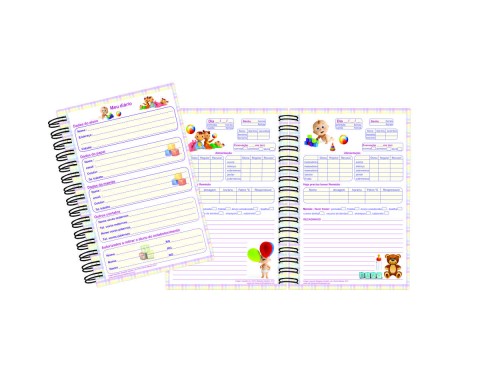 Impresso em 4 cores, incluindo página "Meu diário", dados de alimentação do bebê, banho, outros.