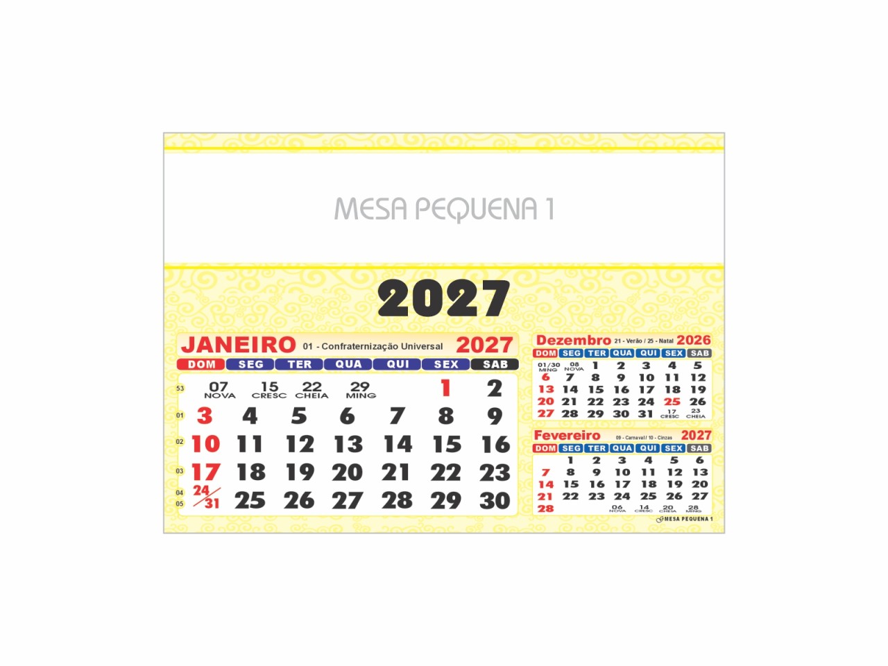 Calendario de Mesa 2027 com Bloco Mensal em papel em couchê.