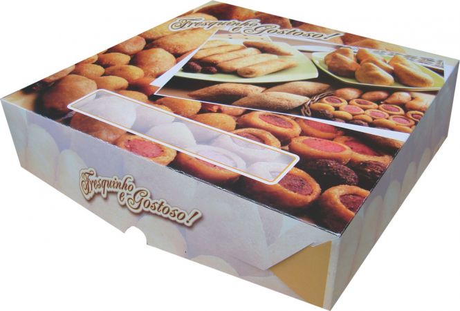 Caixa para Salgado na medida 30 x 30 cm (interna). Tampa impressa em modelo fotográfico (4 cores) em duplex 400g. Espaço reservado para publicidade. Fundo em cartão micro ondulado com uma face branca.